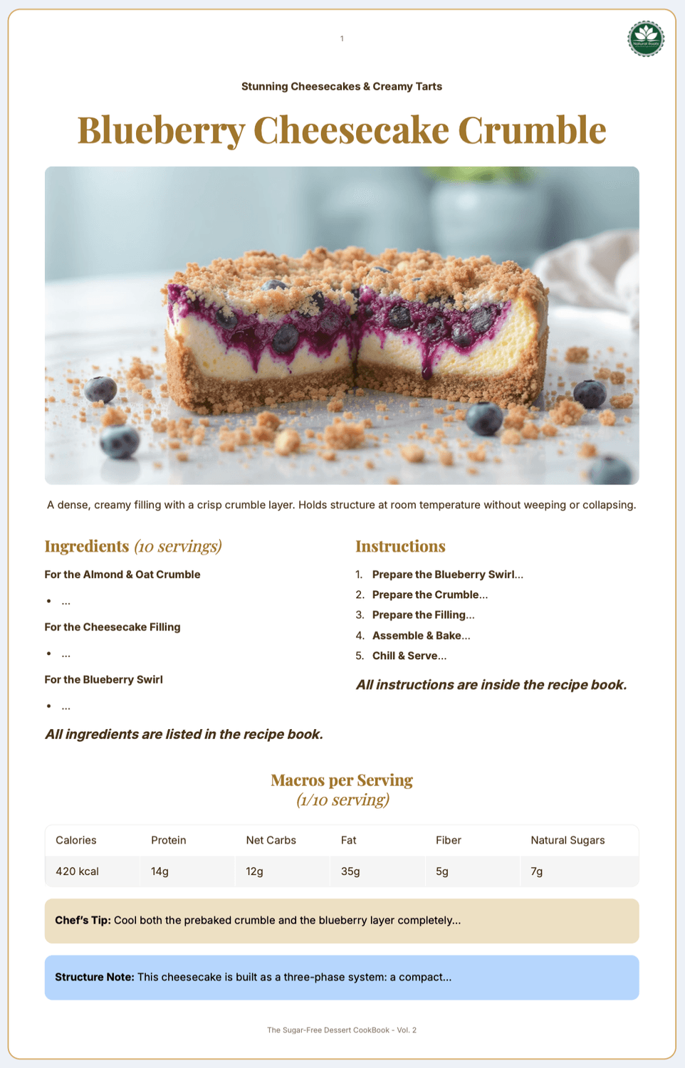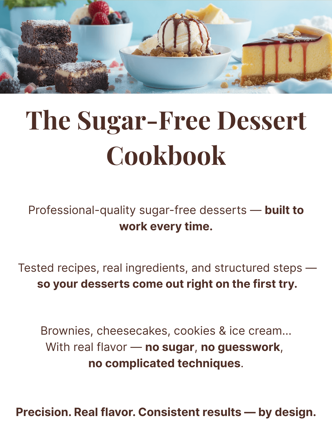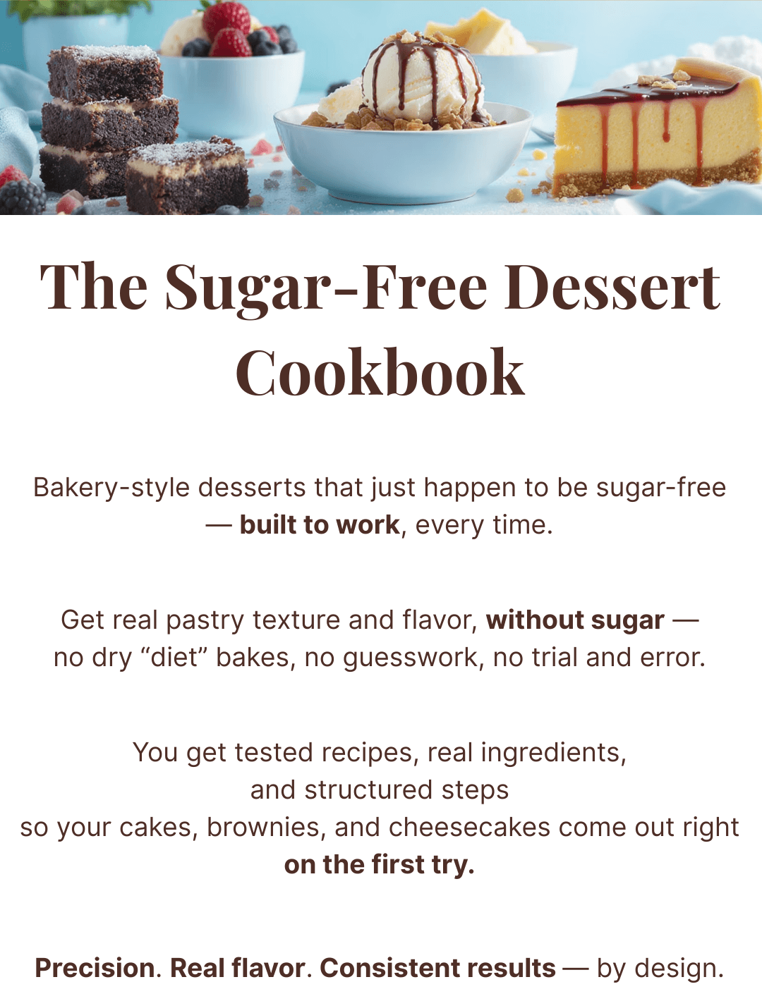 Not 3-ingredient hacks or random swaps. Each recipe is a full formula with calibrated sweeteners, fats and structure—so it bakes and sets like a classic dessert, just without the sugar.