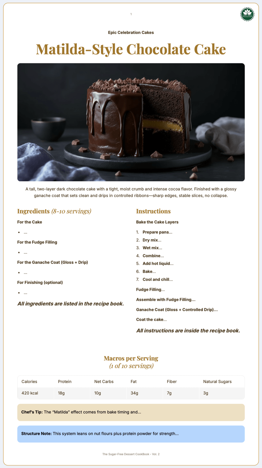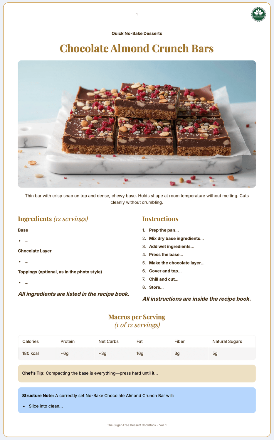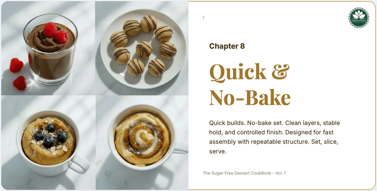 Not 3-ingredient hacks or random swaps. Each recipe is a full formula with calibrated sweeteners, fats and structure—so it bakes and sets like a classic dessert, just without the sugar.