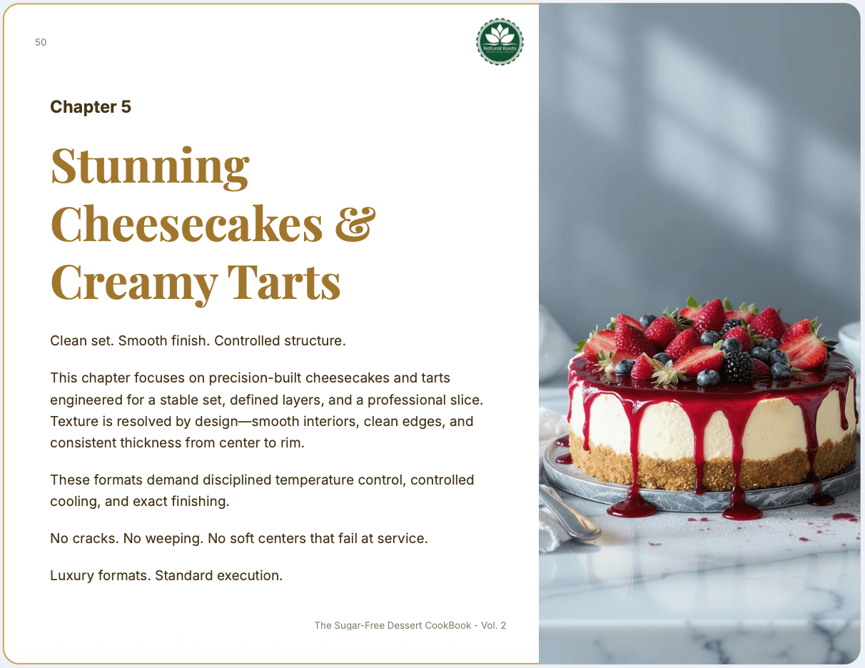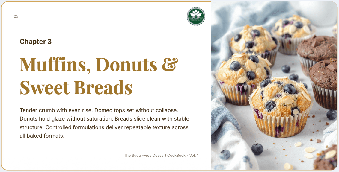Each recipe is developed to control crumb, moisture, rise, and finish, so the desserts don’t taste “diet,” overly sweetener-forward, or dry. The goal is real pastry behavior, without sugar.