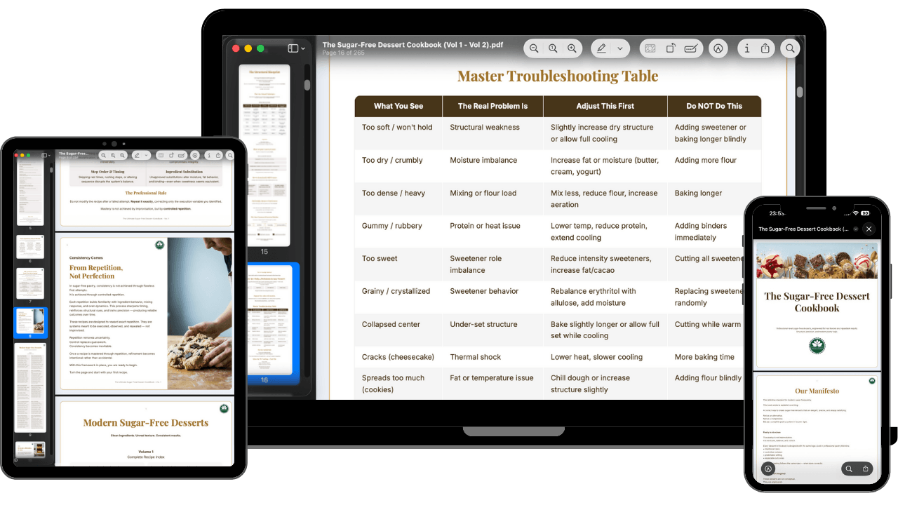 Not another “sugar-free recipe ebook”. This is a structured pastry framework with calibrated ratios and clear steps—so your desserts come out right the first time and stay consistent batch after batch.